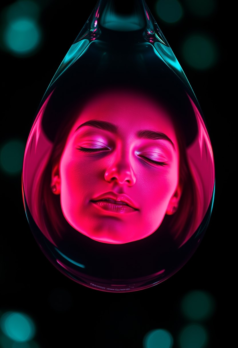 visual art, highly detailed realistic render of a beautiful woman inside a drop of water, eyes closed, black light, bioluminescent, fluorescent