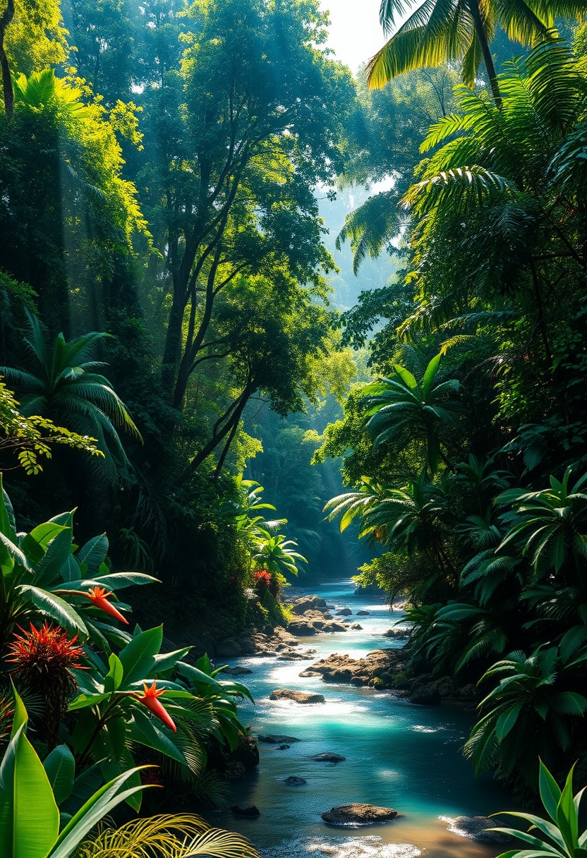 A lush, tropical rainforest landscape with towering trees covered in vibrant green foliage. Sunlight filters through the dense canopy, creating dappled light on the forest floor. A crystal-clear river winds through the jungle, with exotic flowers and plants adding bursts of color to the scene. The atmosphere is alive with the sounds of wildlife, making the viewer feel immersed in the beauty and vitality of nature.