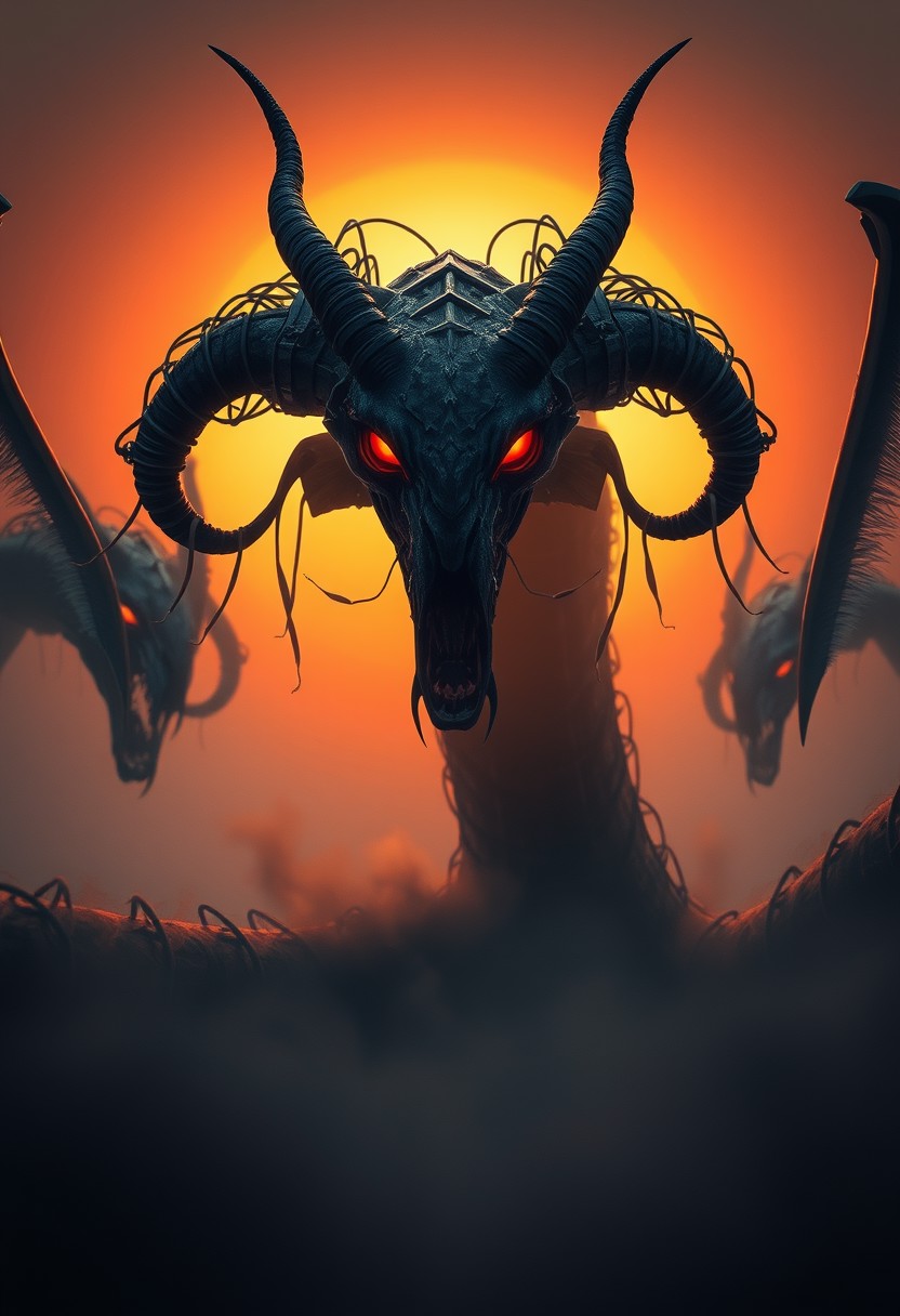 demons, sunrise background, fog, a schematic [drawing|photo|painting] of a tyranical and angry robotic demon horror naga, random [tricolor|duotone] gradient and black, wires, specular tint, subsurface scattering, light visible through thin ears, realistic, highly detailed, 8k, masterpiece, photo, painting, oil, ink, feathers, sand