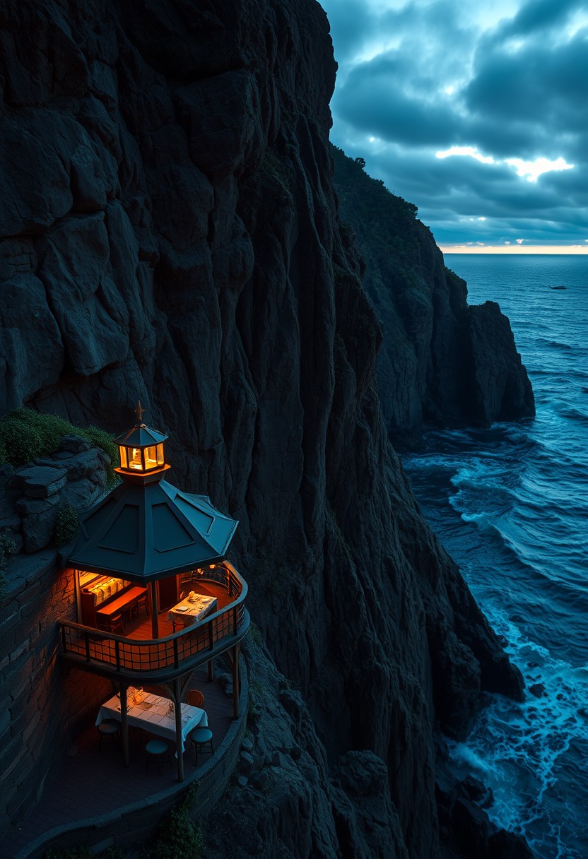 A beautifully lit and composed professional photograph of a small cozy gas lit cafe on the face of a massive cliff face overlooking the a dark stormy ocean at dusk