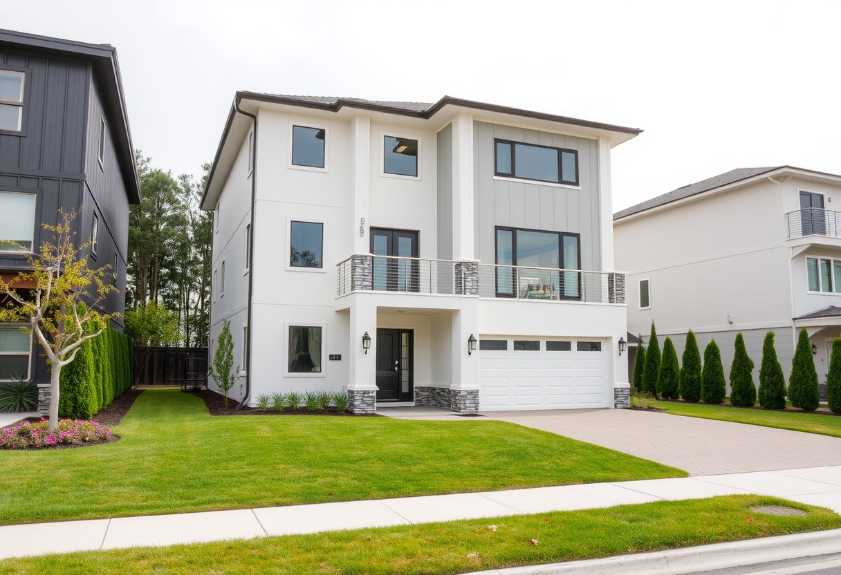 exterior of a modern two story building, decor, wide view, with a garage and lawn