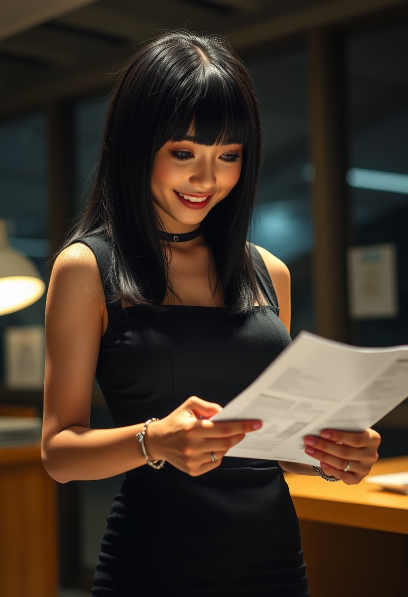 realistic lighting, photo, photorealistic, a 18 years old female, petite, long hime cut hair, black hair, yellow eyes, small breasts, saggy breasts, puffy nipples, small waist, wide hips, toned female, abs, choker, arm bracelet, rings, mascara, cameltoe, fat mons, cheerful, black tight dress, dynamic pose, reading some paperwork, office, scenery, (cinematic angle, cinematic lighting, backlighting, ray light, volumetric light)