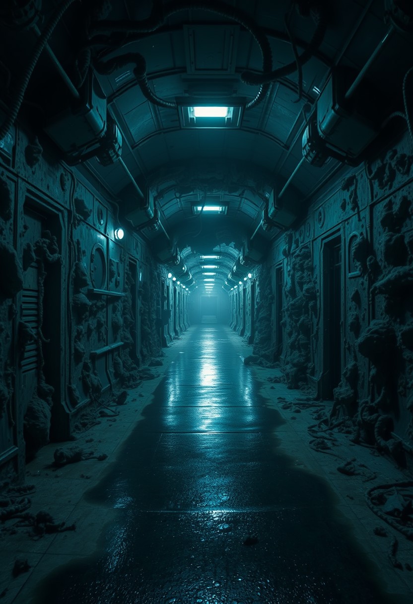 A terrifying corridor within a decaying spaceship, illuminated by a few flickering, weak lights. The walls are covered in strange, pulsating organic matter, and the air is filled with an eerie, low hum. The floor is slick with an unknown, dark substance, and the corridor seems to stretch endlessly into the darkness. There's an overwhelming sense of dread, as if the ship itself is alive and malevolent.