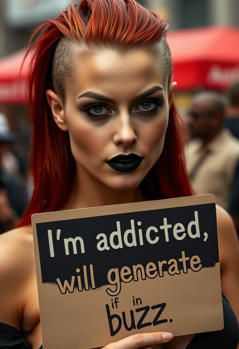 Picket Sign, tan woman in her 20s, smokey eyes makeup with black lipstick, brown eyes, she is holding a Picket sign which says: "I'm addicted, will generate for buzz.", Long red hair shaved on one side with light roots, Large breasts, erotic, perfect face, perfect anatomy, cute, beautiful, perfect beauty, amazing beauty, pure genius, absolutely perfect, gentle, highly detailed, breathtaking, italian beauty