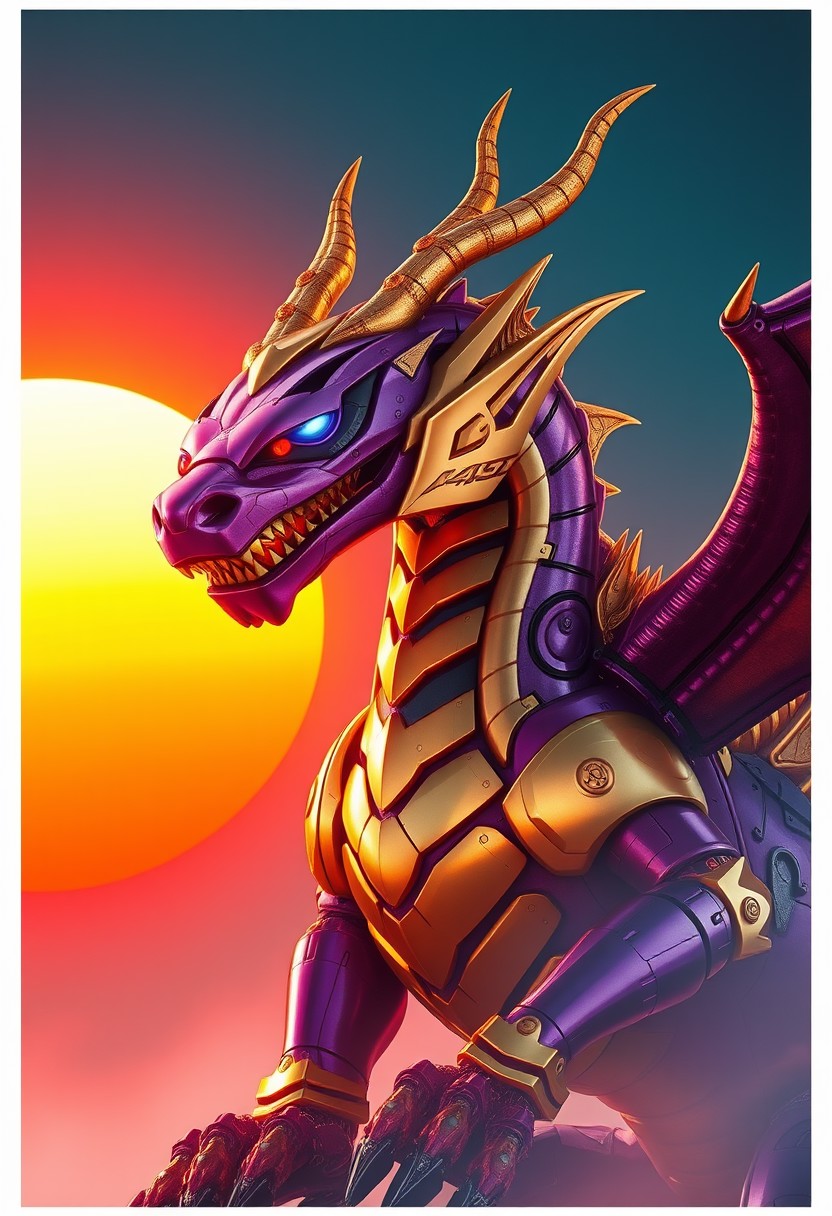 Robot Dragon, purple and gold, cinematic photograph with an orange and blue synthwave sun background.