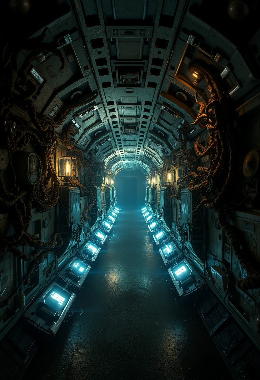 A terrifying corridor within a decaying spaceship, illuminated by a few flickering, weak lights. The walls are covered in strange, pulsating organic matter, and the air is filled with an eerie, low hum. The floor is slick with an unknown, dark substance, and the corridor seems to stretch endlessly into the darkness. There's an overwhelming sense of dread, as if the ship itself is alive and malevolent.