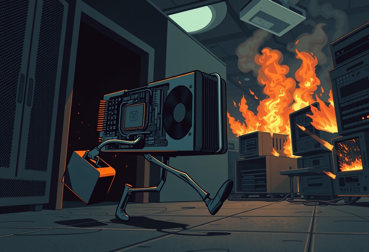 Dramatic action chase closeup, Comic with flat shading, dark server room, A motherboard graphics card from a computer with two metal thin legs holding a suitcase while running away out of door, open computer case in background, burning computer, chaos, many burning computers