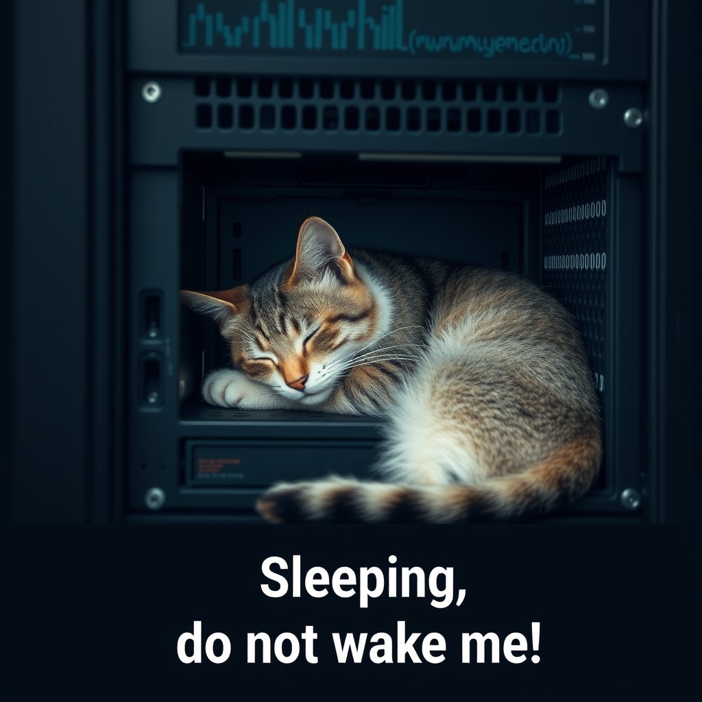 Inside a computer server, a cat is sleeping. Text displays [Sleeping, do not wake me]