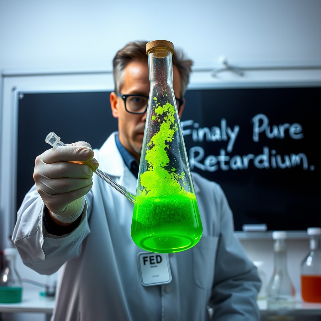a scientist in a laboratory holding an eprubet with a green substance on a blackboard in the background is written: "Finaly Pure Retardium"