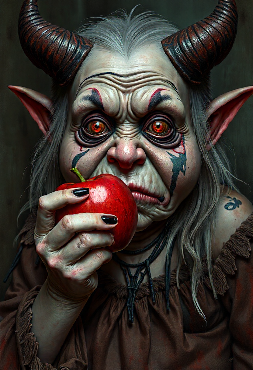 chubby ugly scary, 1witch 35yo holding an apple,neon tattoo on the face, demon theme, high-resolution image that captures the intricate details of the scene, realistic, best quality