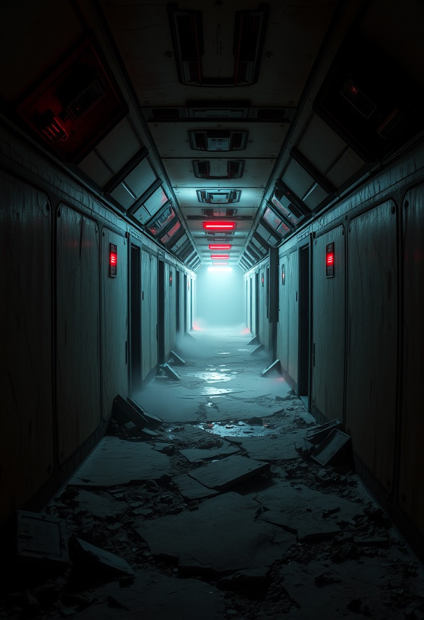 A chilling, abandoned spaceship corridor, with dim, red emergency lights casting an eerie glow. The walls are scarred with deep scratches and burn marks, and strange, unsettling noises echo faintly in the distance. The floor is uneven, with parts of it caved in or covered in debris, and a thick mist hangs low in the air, making it difficult to see what lies ahead. The atmosphere is heavy with fear, as if the corridor is a trap waiting to spring.