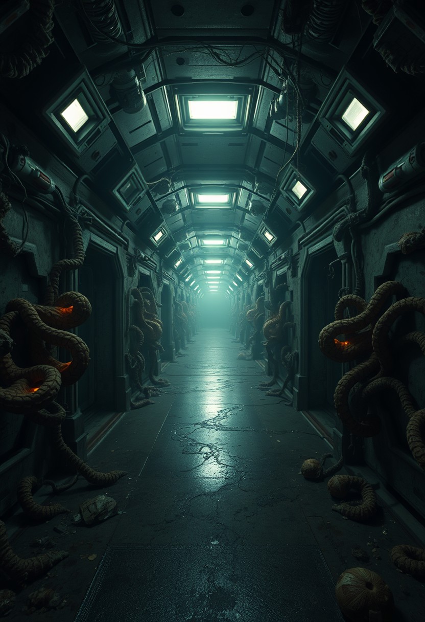 A terrifying corridor within a decaying spaceship, illuminated by a few flickering, weak lights. The walls are covered in strange, pulsating organic matter, and the air is filled with an eerie, low hum. The floor is slick with an unknown, dark substance, and the corridor seems to stretch endlessly into the darkness. There's an overwhelming sense of dread, as if the ship itself is alive and malevolent.