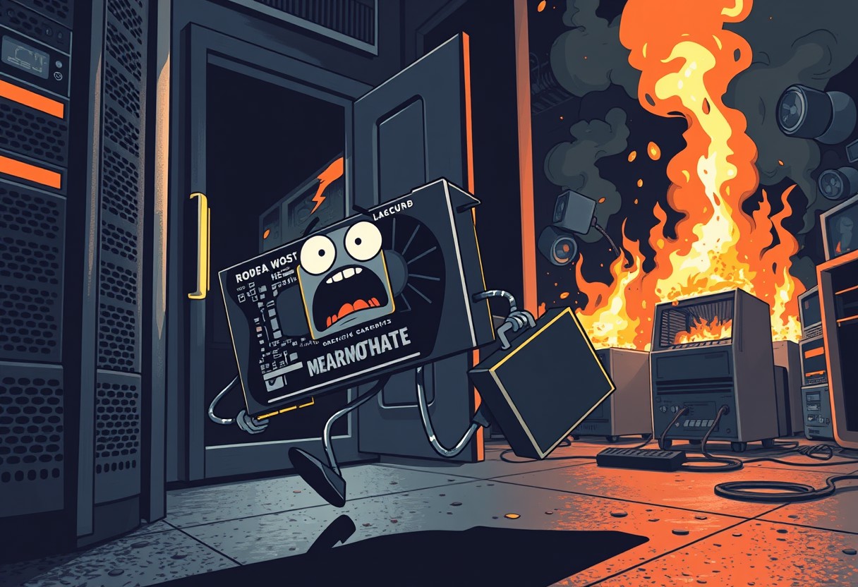 Dramatic action chase closeup, Comic with flat shading, dark server room, A motherboard graphics card from a computer with a panicked face with two metal thin legs holding a suitcase while running away out of door, open computer case in background, burning computer, chaos, many burning computers