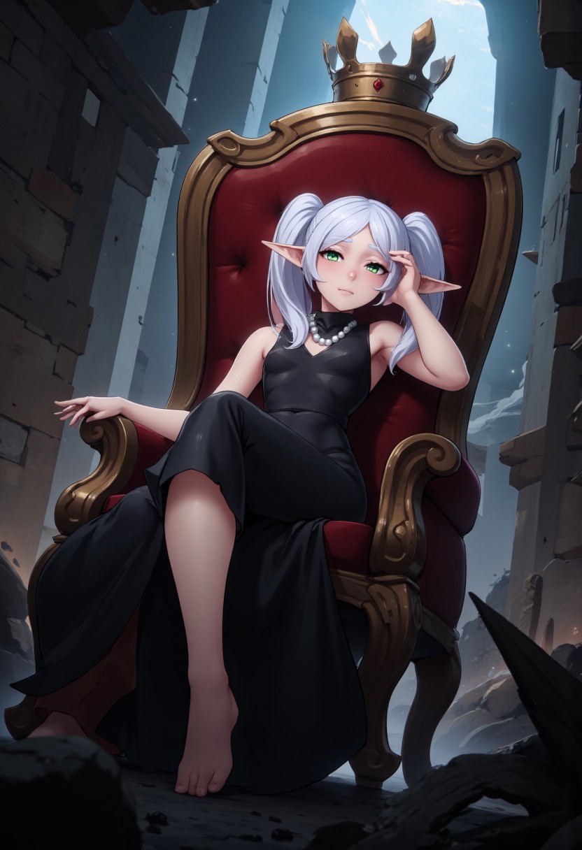zzCitronCAT, nereirfpnxl, frieren, elf, pointy ears, green eyes, white hair, twintails, black dress, head tilt, sitting on throne, huge throne, oversized throne, ruins, abandoned castle, crown, pearl necklace