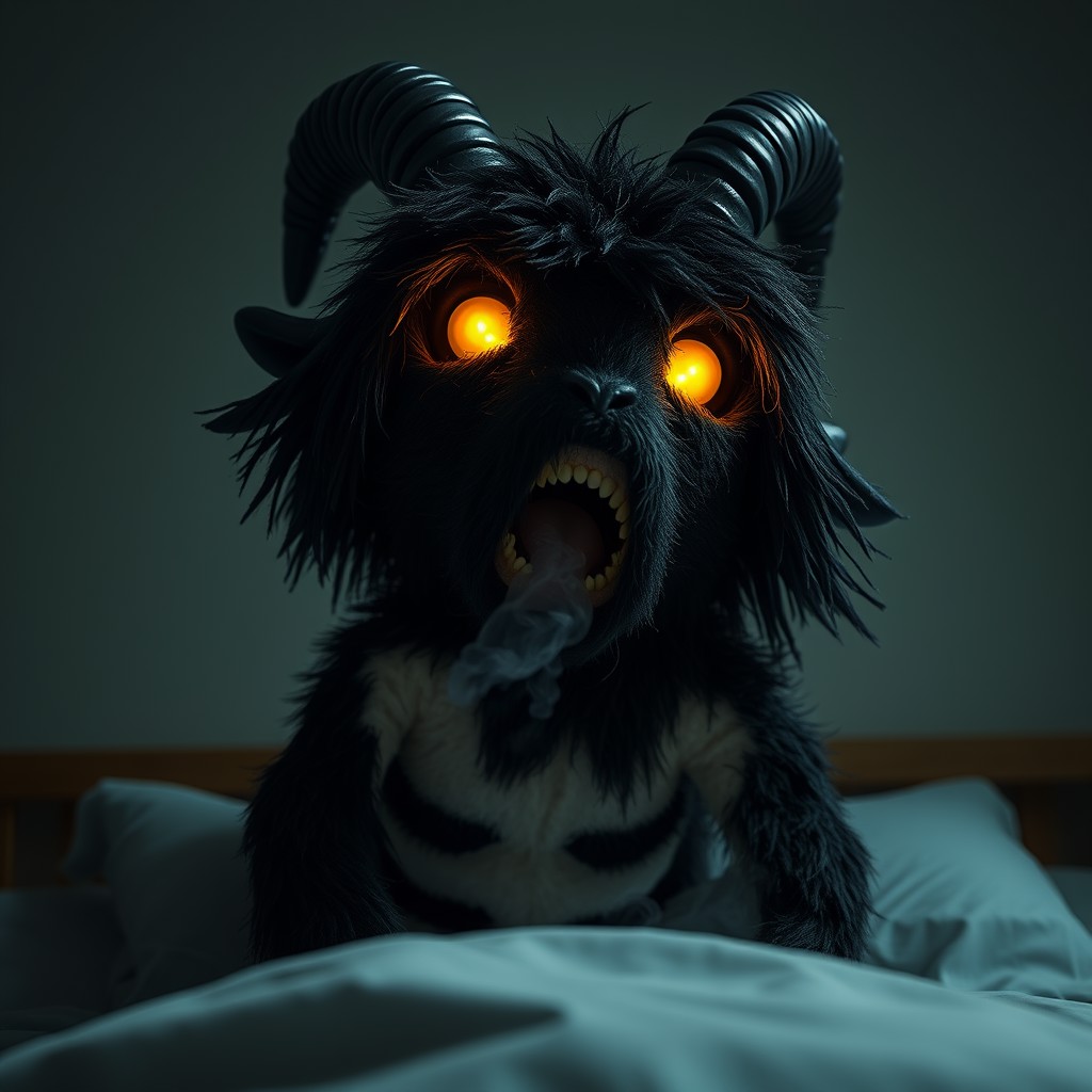 photorealistic pov from below image of a demonic satyr/goatman plushie with black shaggy fur, black horns, glowing golden yellow eyes that are looking down upon you. An eerie mist is coming from its mouth. It is standing above you as you lazily open your eyes from slumber, you try to scream but are unable to do so as the demonic plushie consumes your soul.