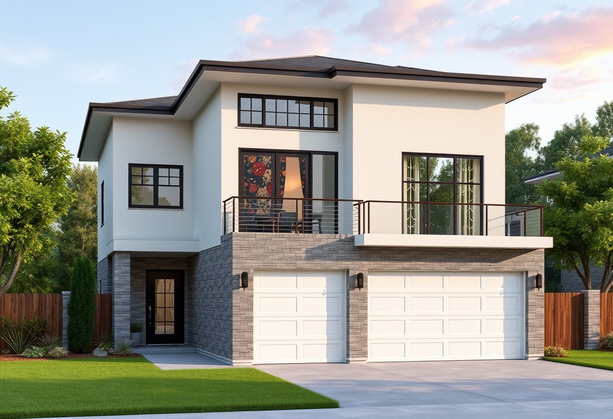 exterior of a modern two story building, decor, wide view, with a garage and lawn