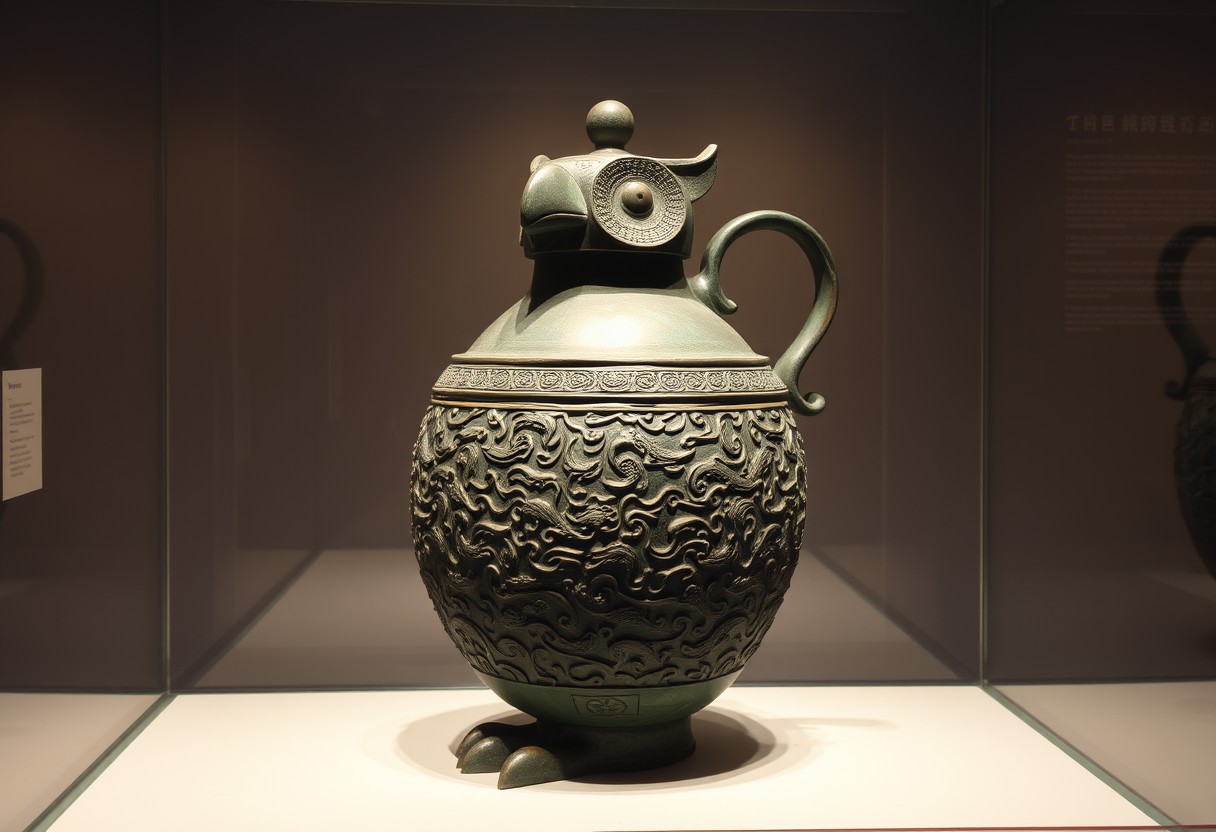 Inside a museum display case is a (single:1.4) 3000 year old Ancient bronze ewer from Shang dynasty of China. The ewer is much taller than it is wide. The ewer is formed in the shape of a stylized owl. The lid of the ewer forms the beak of the owl. the beak and eyes of the owl are the same color as the rest of the owl. It has a handle on the back. instead of feathers, the body of the owl, and the entire ewer, is decorated in (intricately detailed and complex ancient chinese monster_taotie motifs:1.5). The ewer is made of heavily oxidized bronze that appears green because, and the metal has corroded and crusted in minerals over the centuries since it was crafted.