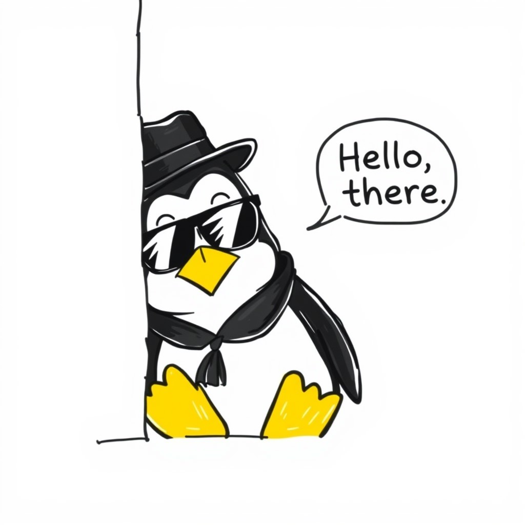 Drawing of Tux, the linux mascot penguin peeking from around the corner of the building, wearing black spy hat and sunglasses. White background. He is saying "Hello there" in a speech bubble.