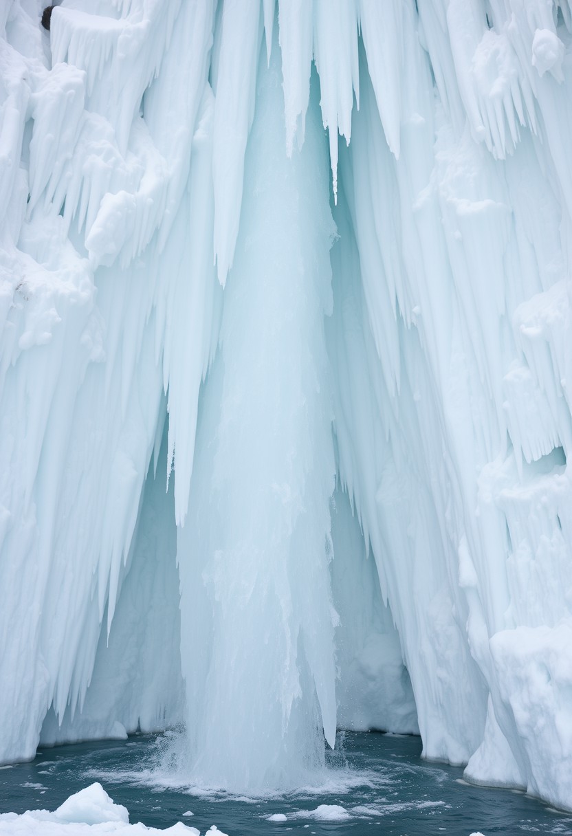 A large icy waterfall, a waterfall in ice from which frozen body parts are visible