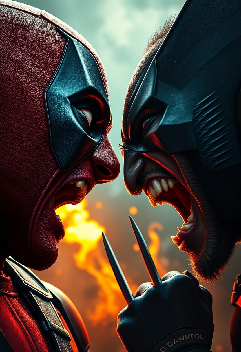 Deadpool and Wolverine screaming at each other, face closeup, chaos, apocalyptic, movie poster style, cinematic lighting