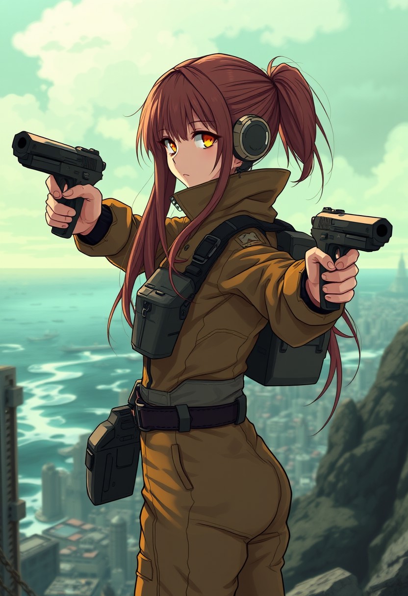 1girl, ((side view))), looking at viewer, highly detailed, from front, 1girl, skinny, looking at viewer, masterpiece, best quality, raw, extremely detailed, hyperrealism, photo, perfect anatomy, source_photo, source_real, solo, looking at viewer, 1girl, full body, ((khaki haznat suit:1.5)), dynamic pose, pistols in hands BREAK looking at viewer, long hair, ((light brown hair)), long hair, dynamic pose best quality, depth of field, bokeh, (((full clothed))), ((khaki haznat suit)), BREAK ((((big futuristic gun in hands)))), (big futuristic pistol in hands:1.3), adventuress, dynamic pose, military hamzat suit (((((post-apocalyptic city ruin, light blue ocean, green cloudy sky:1.9))))) score_9, score_8_up, score_7_up, score_6_up, source_cartoon, rating_explicit, Expressiveh, (((((upper body))))), dynamic pose <lora:DandonFuga_Style_v.2_-_Pony:0.8>
