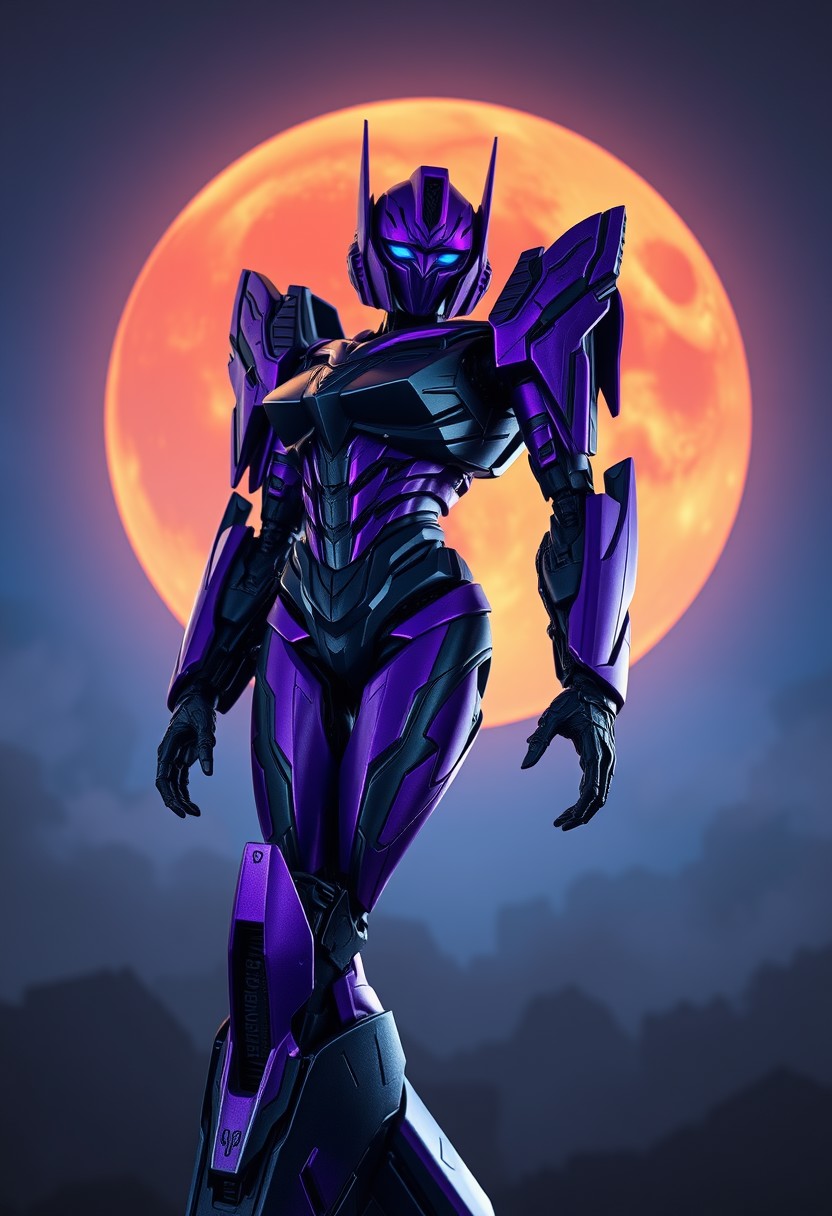 Female Robot, Purple and black Soundwave transformer full body cinematic photograph with an orange and blue synthwave moon background. Slightly turned. Dragon theme.