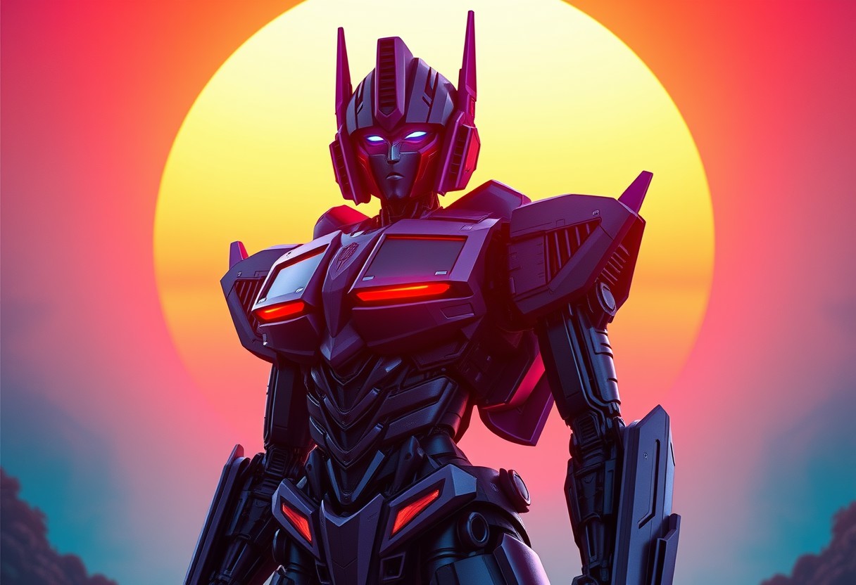 Female Robot, Purple and black Optimus Prime full body cinematic photograph with an orange and blue synthwave sun background. Slightly turned. Dragon theme.