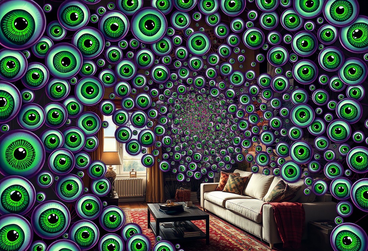 many hundreds of green eyes fractal spiralling illustration psychedelic hallucination visuals, overlaid layer of spiral eyes over a normal scene in a living room, transparency layer