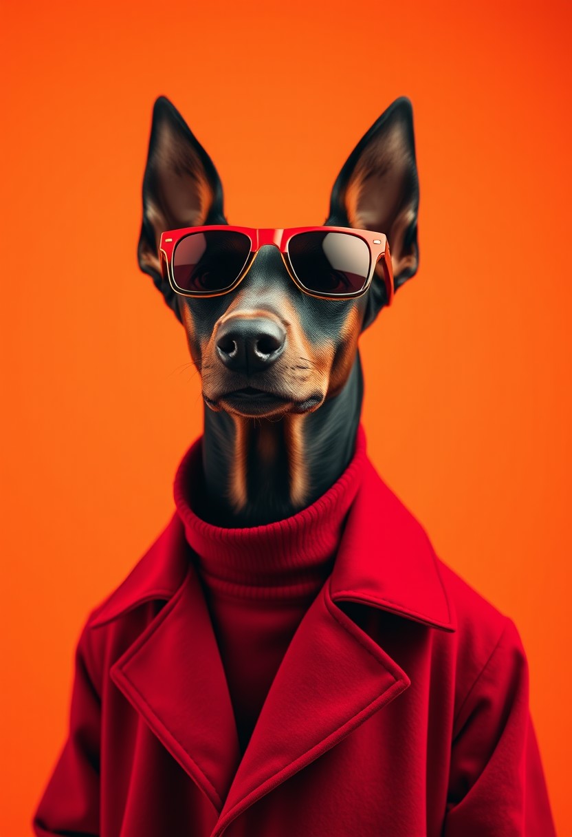 The best mobile wallpaper, Award-winning wallpaper, Portrait Photography, In front view is a portrait of a dobermann wearing 1960s mid-century space-age fashion, Side view shot, Shot with Canon EOS R5, Setting a stark contrast that accentuates the subject, Fluorescent maroon shade, Wearing a very fashionable lounge coat and sunglasses are a hip 1960s style, Clothing all in one color, Beautiful background