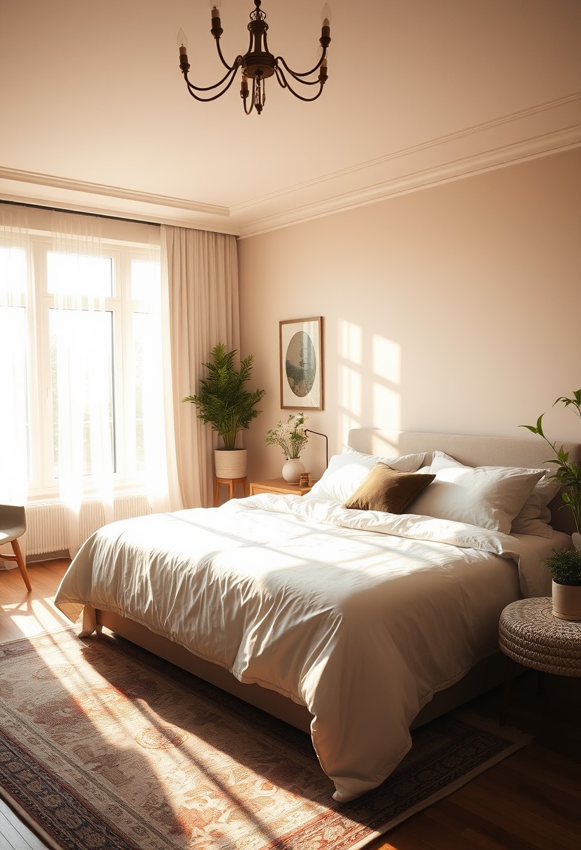 A cozy bedroom featuring a large bed as the focal point, with soft, inviting bedding and plush pillows. The room is bathed in gentle, warm morning light streaming through a large window, casting a soft glow over the entire space. The light creates delicate shadows on the floor and highlights the textures of the fabrics and furniture. The interior is tastefully decorated with subtle, elegant details such as a bedside table with a lamp, a rug with intricate patterns, and a few potted plants adding a touch of greenery. The overall atmosphere is serene and welcoming, with the morning light enhancing the room's peaceful ambiance.