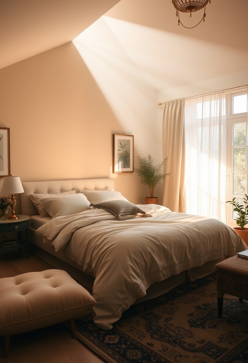 A cozy bedroom featuring a large bed as the focal point, with soft, inviting bedding and plush pillows. The room is bathed in gentle, warm morning light streaming through a large window, casting a soft glow over the entire space. The light creates delicate shadows on the floor and highlights the textures of the fabrics and furniture. The interior is tastefully decorated with subtle, elegant details such as a bedside table with a lamp, a rug with intricate patterns, and a few potted plants adding a touch of greenery. The overall atmosphere is serene and welcoming, with the morning light enhancing the room's peaceful ambiance.