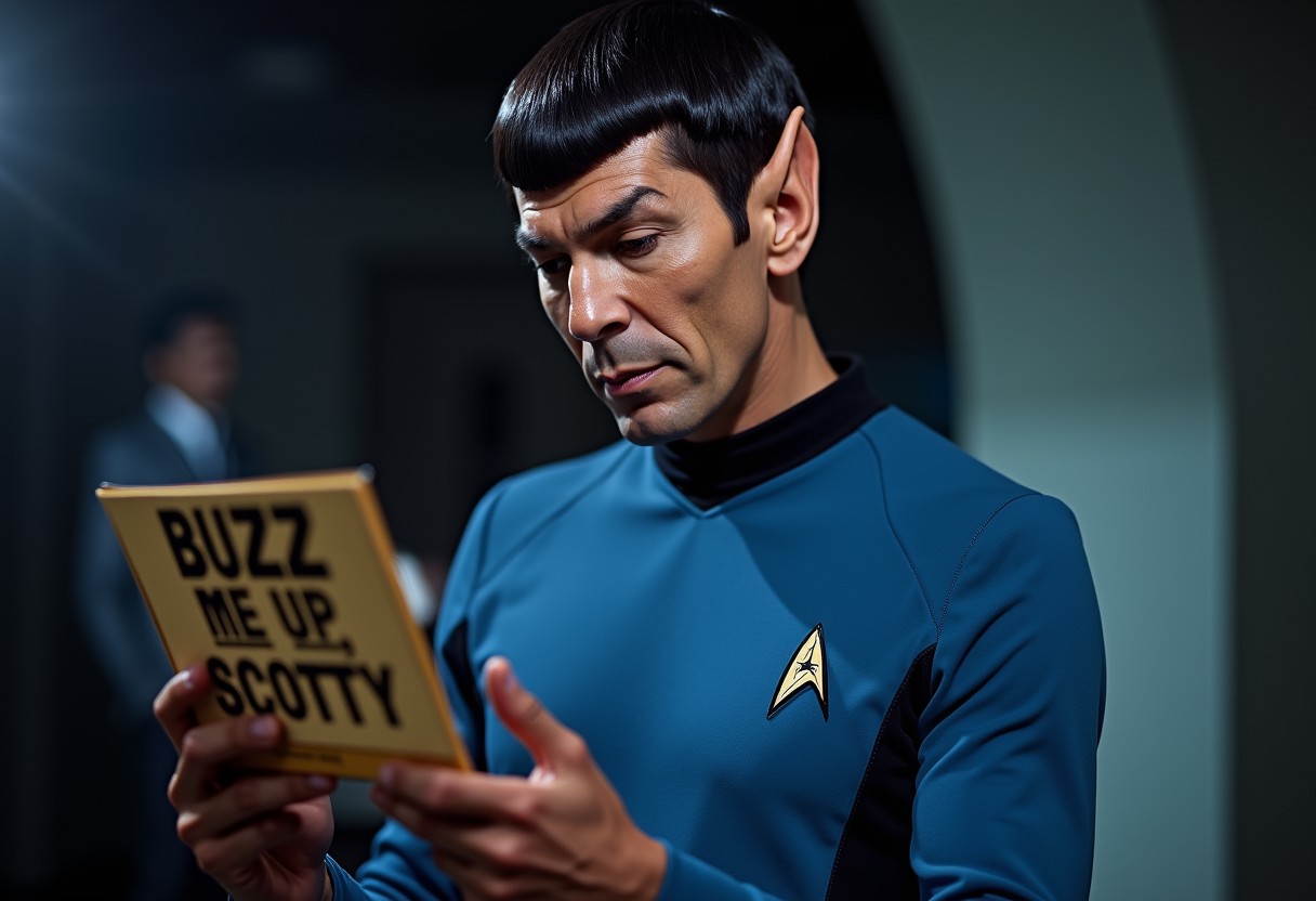 raw lighting, overexposed, harsh flash,,score_9, score_8_up, score_7_up, score_6_up,masterpiece, ultra-realistic 8k, (best quality), highly detail, sharp, detailed,higher resolution textures, 4k graphic resolution, 1male, solo, Spock, star trek, pointed ears, half man, half vulcan, sharply jutting eyebrows, perfect eyes, blue shirt with black trim, star trek emblem on shirt, black hair, pose, holding a tricorder device, looking downwards,Expressiveh ,light rays,lens flare,light particles,beautiful color, detailed, amazing quality, 3/4 perspective,flux-style,logo, holding sign that says "Buzz me up, Scotty."