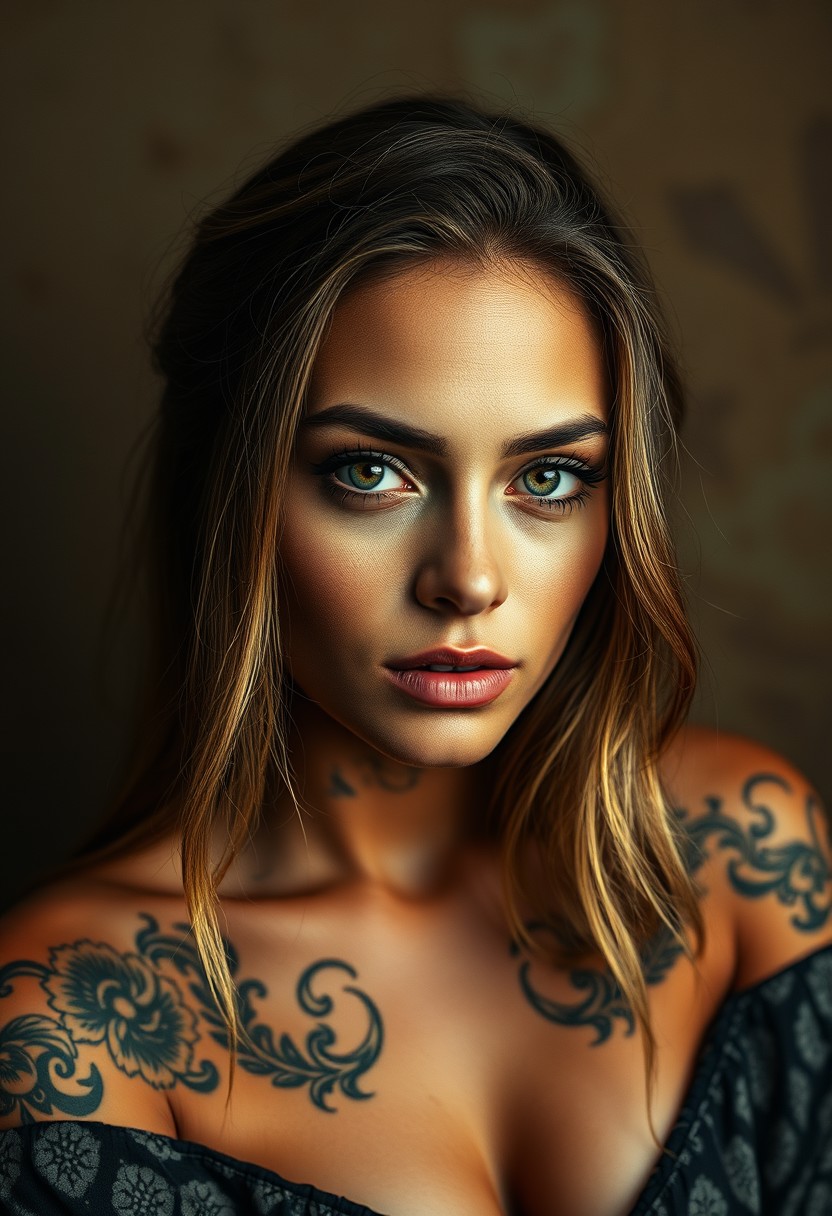 Gorgeous woman portrait, she have face skin covered by tattoed random words