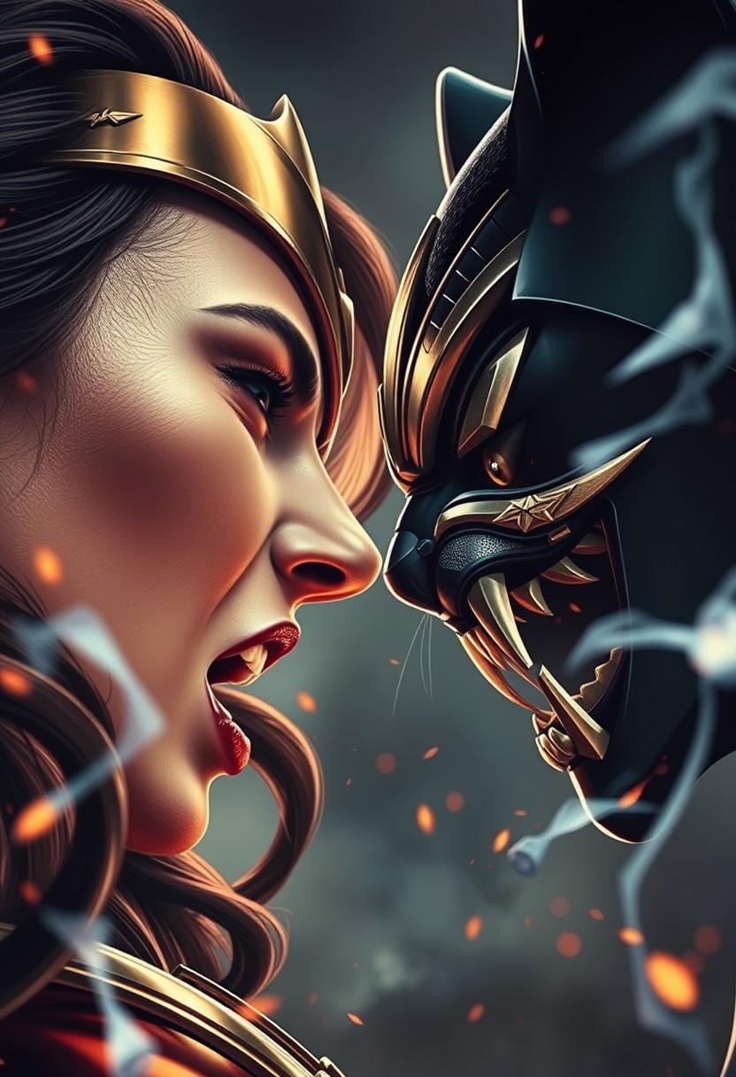 Wonder-woman and cat-woman screaming at each other, face closeup, chaos, apocalyptic, movie poster style, cinematic lighting