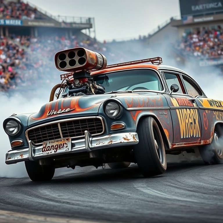 a demolition derby car a rugged, battle-ready appearance, built more for function than aesthetics. The car looks like a war machine on wheels, ready to take on the chaos of the derby arena, with a blend of strategic modifications and a hint of creative flair in its paint job. Its doing a curve, dramatic scene, front side street level view. Smoke from the tires. A backgrouns has a stadium crowd. The plate says "danger" and at the side there is a writing "wreck". A supercharger is over the hood