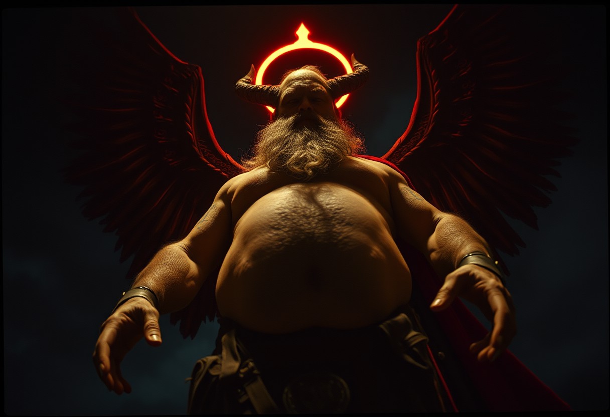 seen from below, closeup from below, boring very low quality super8 photo, retro arthouse film stll photograph, dark hazey cinematic atmosphere, random camera angle, liminal space, dreamcore, cinematic highfantasy movie scene photograph at night with dark shadows and a hazey atmosphere, detailed indirect light, very friendly, massive tanned hairy strongman bodybuilder grandpa physique with a big round belly, hairy belly, extremely hairy, hairy chest, dense bodyhair, Heavenly hairy demon grandad with glowing halo and horns and tanned skin, thin waist, warrior, knight, leather strap harness and long red cape, military general, short wavey gray hair, black nails, friendly with open arms while leaning forwards in ronmantic intimate pose with a dynamic closeup camera angle, dynamic aggressive pose, walking towards viewer, many occult magic rune tattoos glowing up in red, bronze bracelets, hellish landscape, black clouds in dark nightsky, black feathered angel wings,
