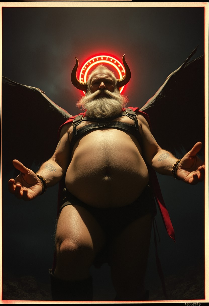 seen from below, closeup from below, boring very low quality super8 photo, retro arthouse film stll photograph, dark hazey cinematic atmosphere, random camera angle, liminal space, dreamcore, cinematic highfantasy movie scene photograph at night with dark shadows and a hazey atmosphere, detailed indirect light, very friendly, massive tanned hairy strongman bodybuilder grandpa physique with a big round belly, hairy belly, extremely hairy, hairy chest, dense bodyhair, Heavenly hairy demon grandad with glowing halo and horns and tanned skin, thin waist, warrior, knight, leather strap harness and long red cape, military general, short wavey gray hair, black nails, friendly with open arms while leaning forwards in ronmantic intimate pose with a dynamic closeup camera angle, dynamic aggressive pose, walking towards viewer, many occult magic rune tattoos glowing up in red, bronze bracelets, hellish landscape, black clouds in dark nightsky, black feathered angel wings,