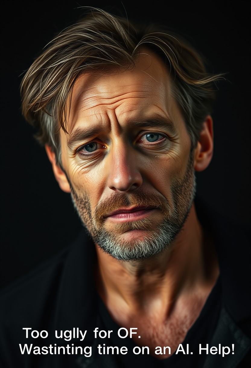 Emotional portrait photograph of a crying middle aged European man saddened by the realization of a wasted life. He looks disheveled with unkempt hair and beard stubble. He does not manage to control his despair and tear roll on his face. The portrait is lit like a Rembrandt masterpiece with a pitch black backdrop. A caption under the picture reads "Too ugly for OF. Wasting time on AI. Help!"