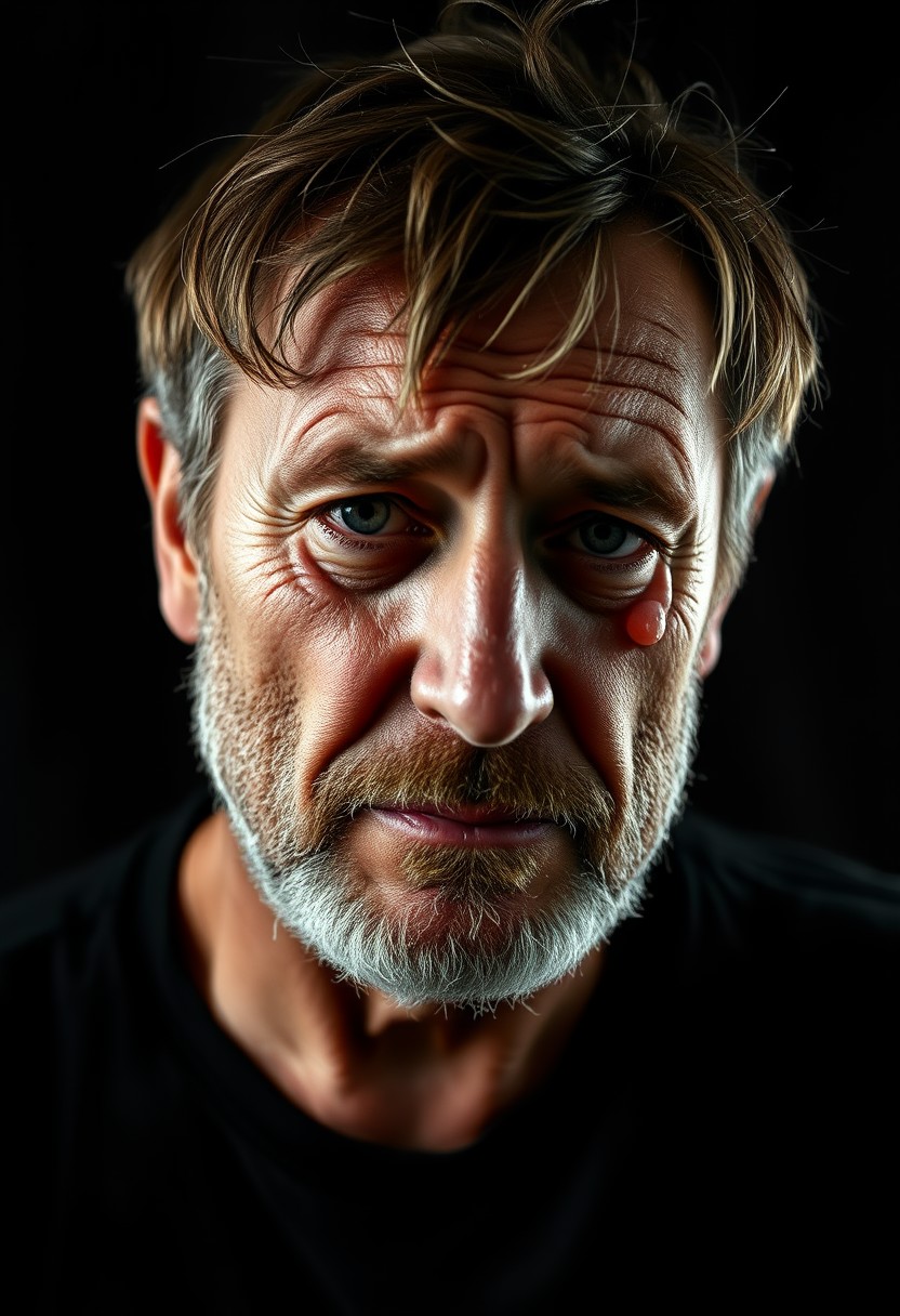 Emotional portrait photograph of a crying middle aged European man saddened by the realization of a wasted life. He looks disheveled with unkempt hair and beard stubble. He does not manage to control his despair and tear roll on his face. The portrait is lit like a Rembrandt masterpiece with a pitch black backdrop. A caption under the picture reads "Too ugly for OF. Wasting time on AI. Help!"