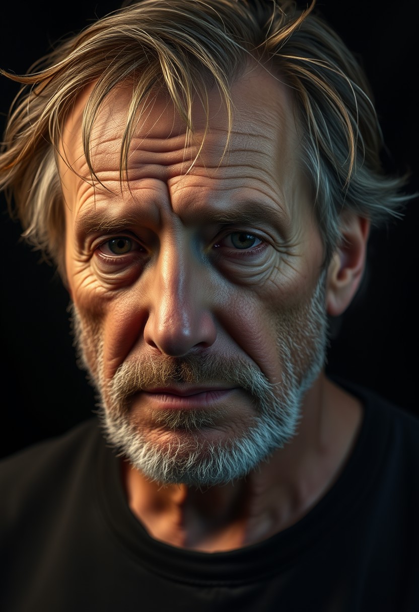 Emotional portrait photograph of a middle aged European man saddened by the realization of a wasted life. He looks disheveled with unkempt hair and beard stubble. He does not manage to control his despair and tear roll on his face. The portrait is lit like a Rembrandt masterpiece with a pitch black backdrop. He says is a caption: "too old and too ugly for only fans. I waste my life on AI waifu. I need help."