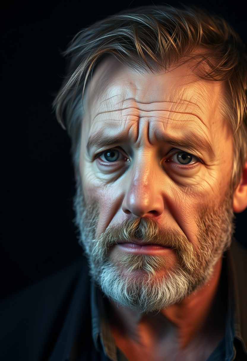 Emotional portrait photograph of a middle aged European man saddened by the realization of a wasted life. He looks disheveled with unkempt hair and beard stubble. He does not manage to control his despair and tear roll on his face. The portrait is lit like a Rembrandt masterpiece with a pitch black backdrop. He says is a caption: "too old and too ugly for only fans. I waste my life on AI waifu. I need help."