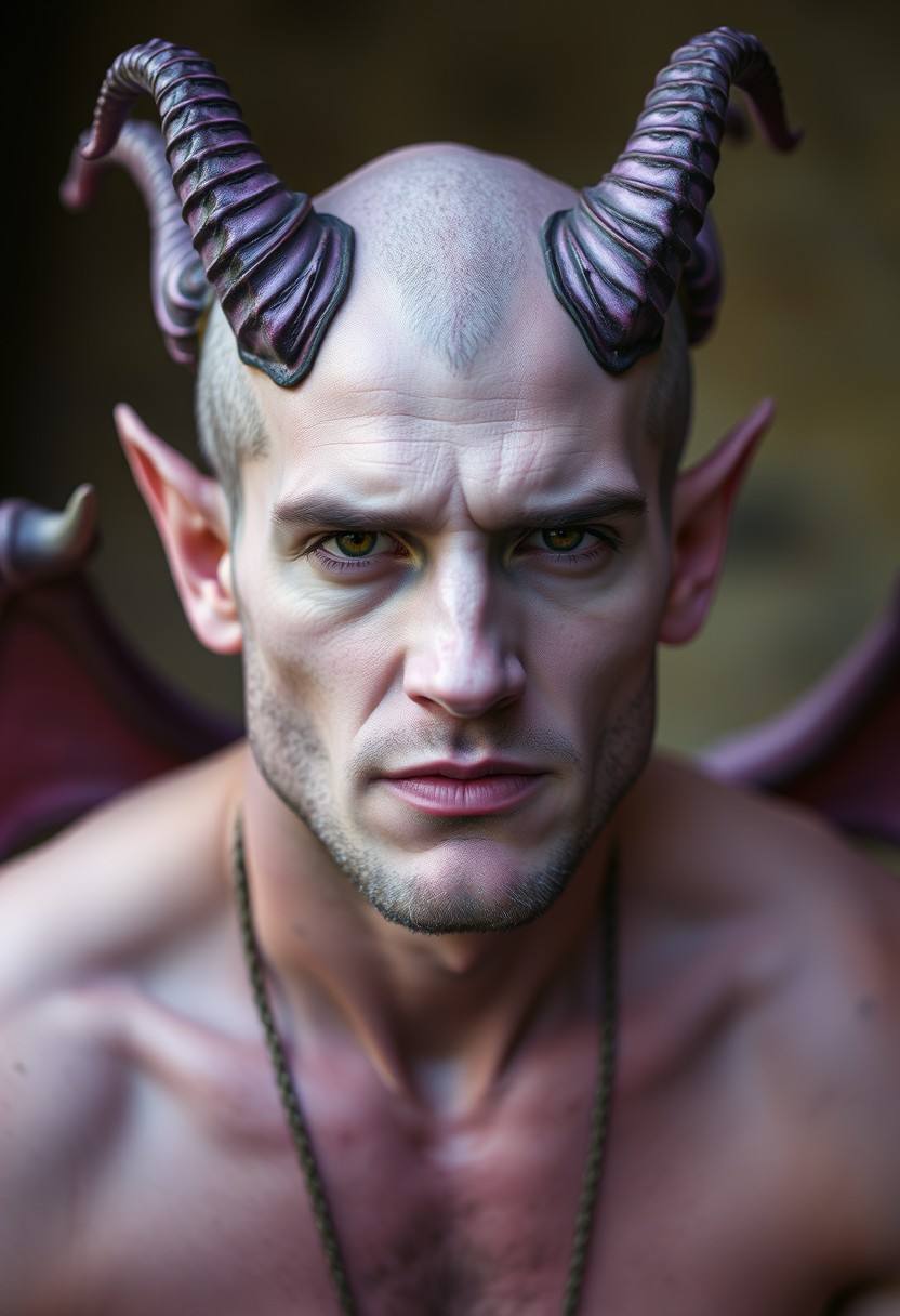 Handsome demon man with lavender skin and curling purple horns. Photograph 35mm.