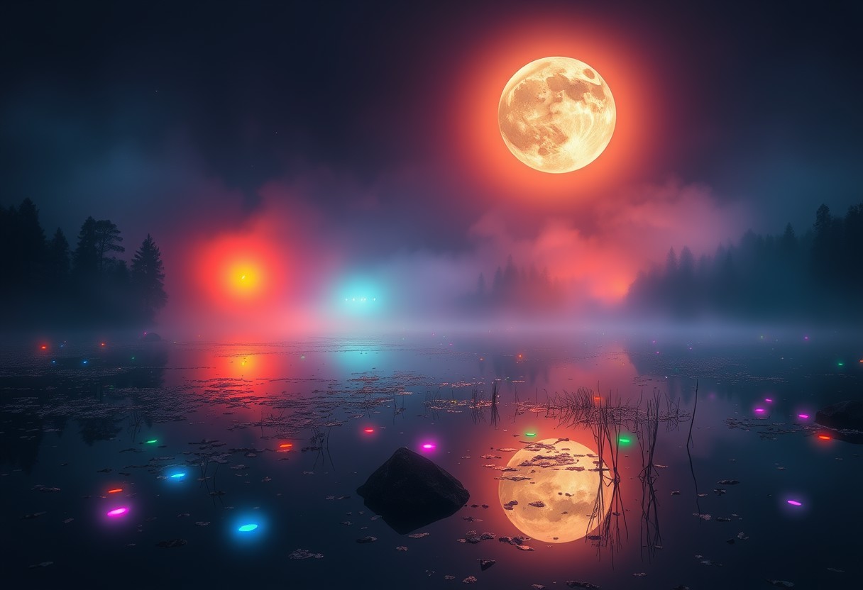 The reflection of the moon on the lake was a sign that the end was coming Ethereal, surreal, dreamlike, multicoloured lights floating around, mist