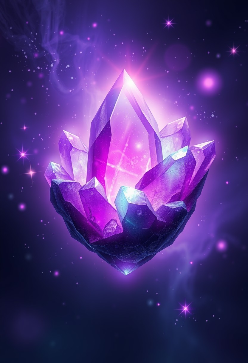 A purple green magical crystal floating in the air, the galaxy is refracting within the crystal, magic glow, purple glow, green glow, illuminated, masterpiece, highly detailed, graphic,