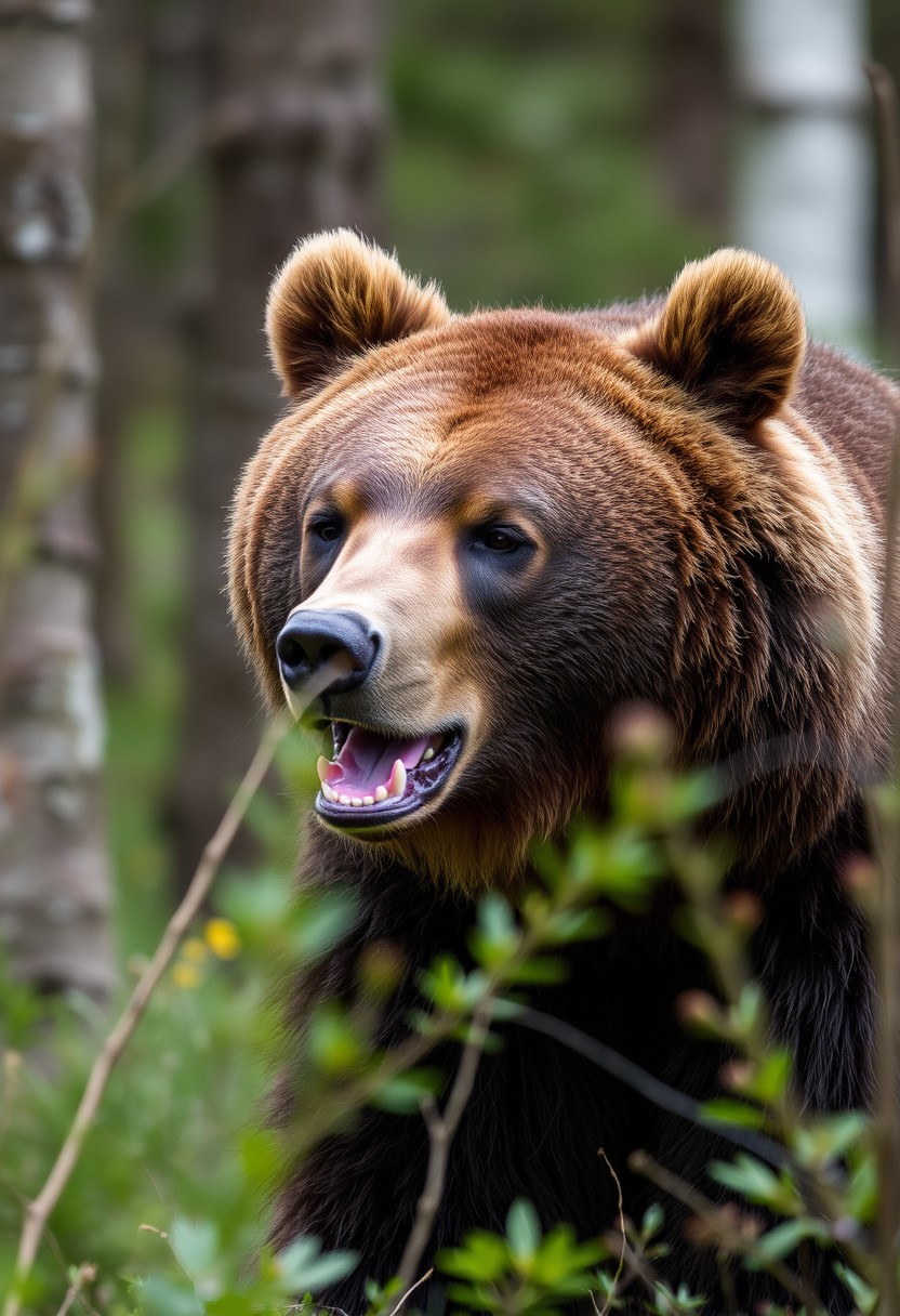 Closeup of a grizzly bear in an enchanted forest doing what bears do.