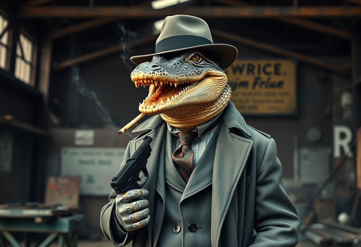 A crocodile wearing a 1920's trenchcoat, suit and tie, borsalino hat, great depression vibes, holding a gun, smoking a cigarette, abandoned factory background, looking at viewer, masterpiece, 4k, highly detailed, best quality,
