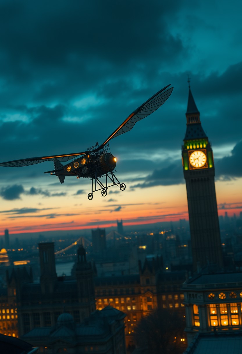 cinematic shot of steampunk ornithopter flying above victorian london at dusk, high resolution