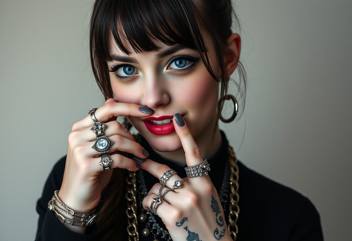 alternative goth girl, bunch of jewelry, young, model, aesthetic photo, beautiful skin, pretty face, bangs, finger on lips, many rings, pale skin, realistic, blue eyes, black attire, intricate jewelry, chain in nose, smile, a lot of piercings, creative tattoos