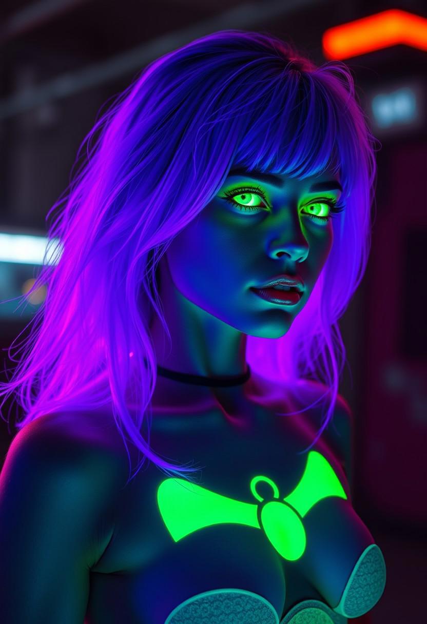 close-up shot, full body in view, beautiful woman, body glowing from radiation, hair glowing bright neon purple, eyes glowing neon green, post-apocalyptic cyberpunk setting
