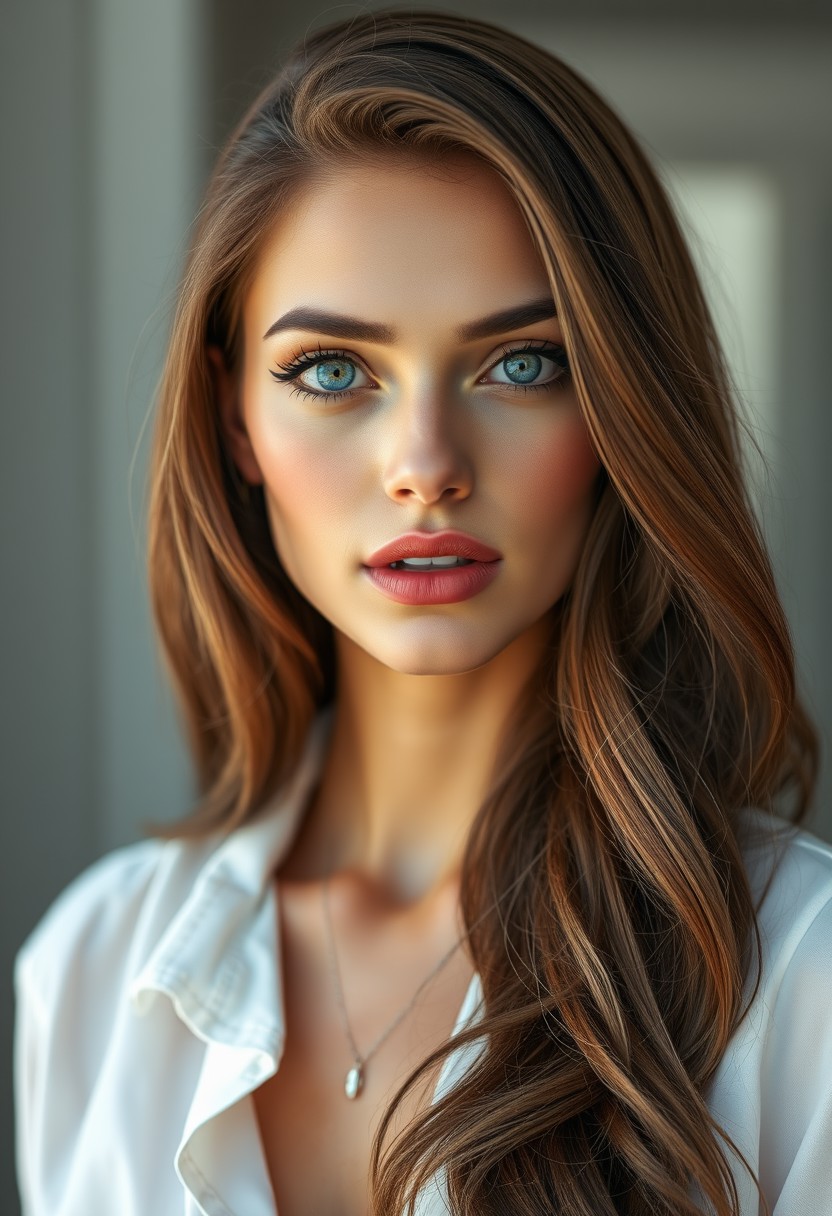 a stunning supermodel, a single girl with realistic features, she has long, wavy brown hair and striking blue eyes, detailed with mascara and delicate eyeshadow. Her face has a straight nose, thin lips, and parted lips revealing her teeth, all accentuated with lilac lipstick and a touch of blush. Her makeup is subtle and flawless, complementing her perfect skin. She wears a white blouse that highlights her collarbone